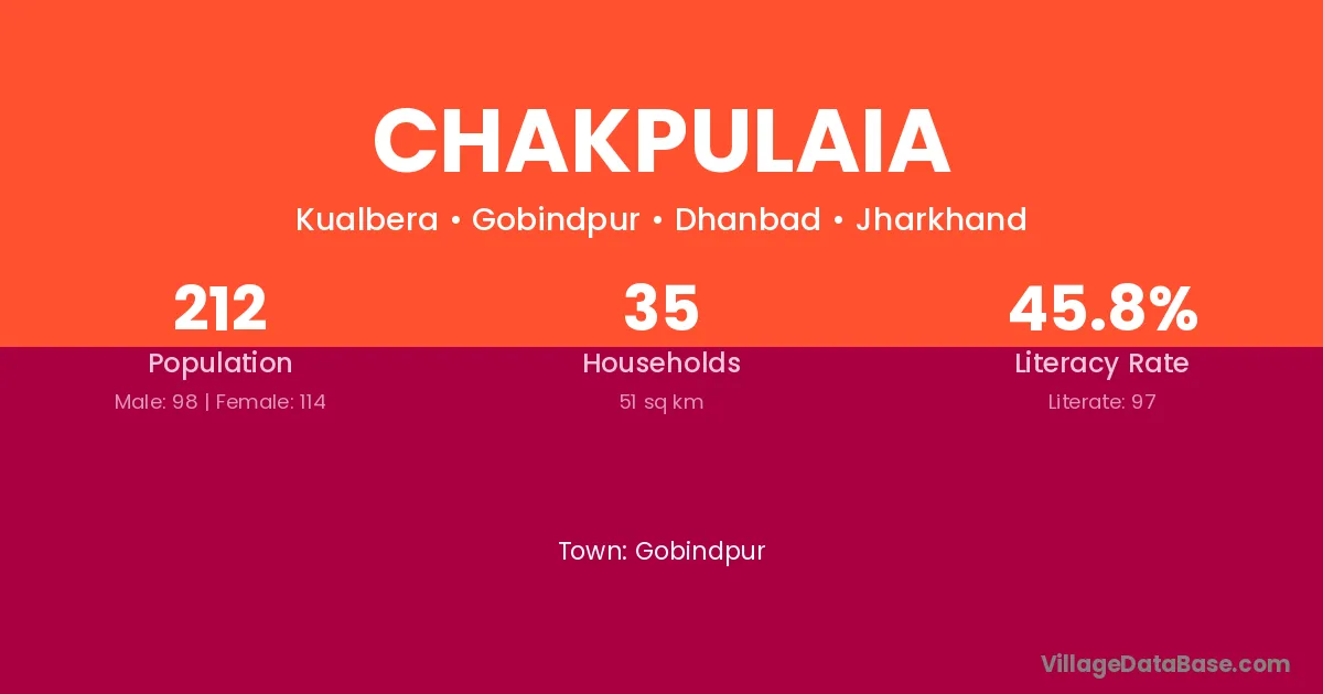Chakpulaia village has a total population of 212 people, of which 98 are males and 114 are females.
