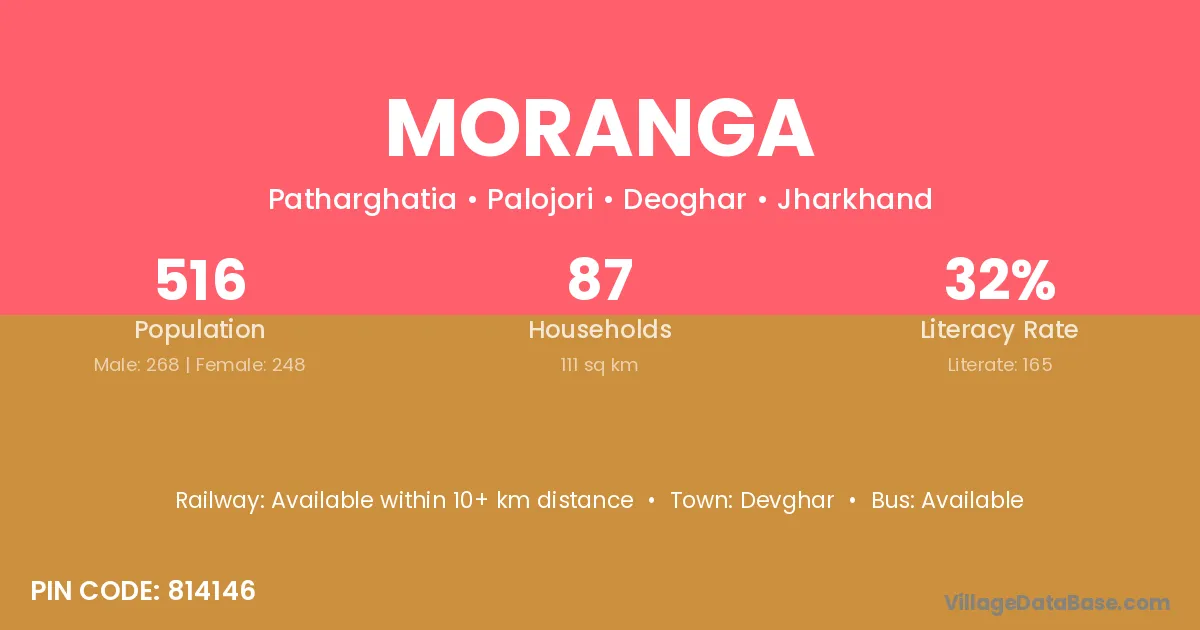 The literacy rate of Moranga village is 59.33%. Male literacy stands at 75.70% and female literacy at 40.58%.