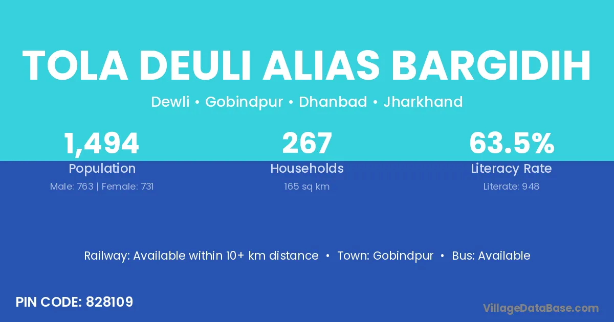 Tola Deuli Alias Bargidih village has a total population of 1,494 people, of which 763 are males and 731 are females.