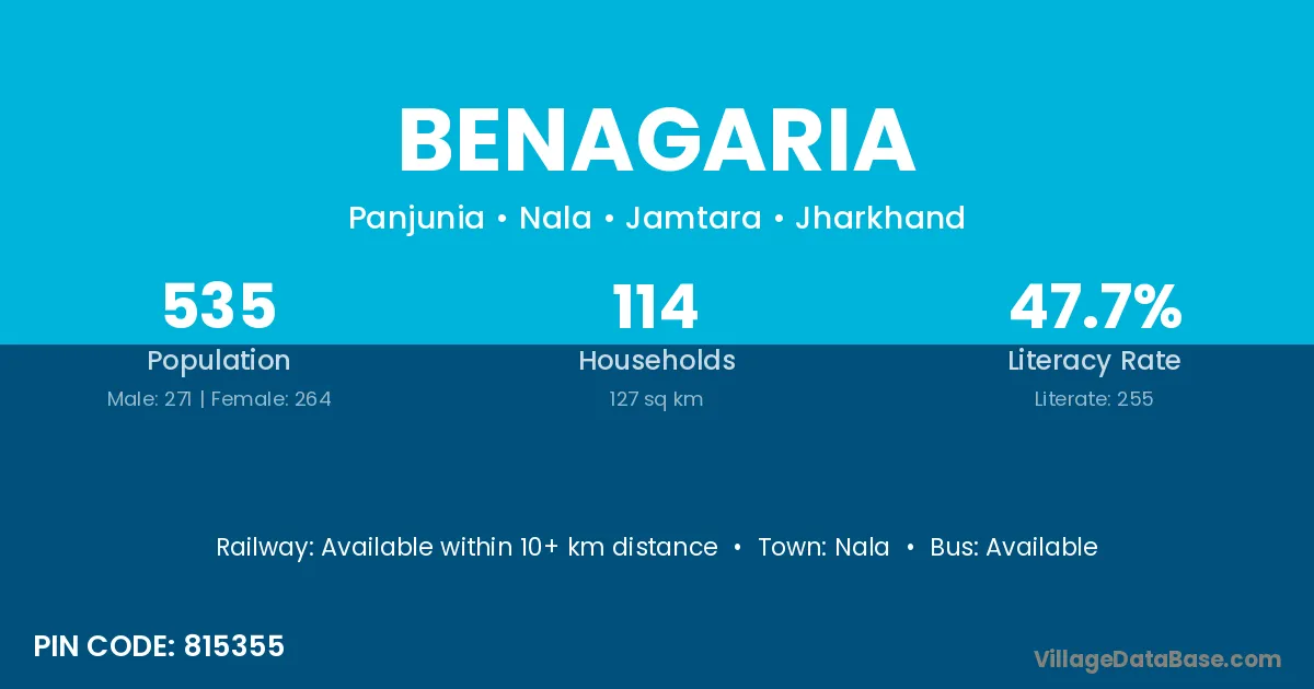 The literacy rate of Benagaria village is 50.58%. Male literacy stands at 63.33% and female literacy at 37.94%.