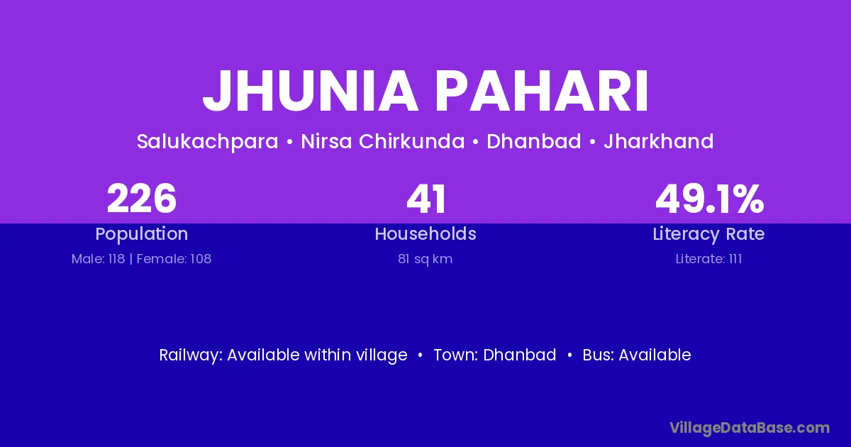 Jhunia Pahari village has a total population of 226 people, of which 118 are males and 108 are females.