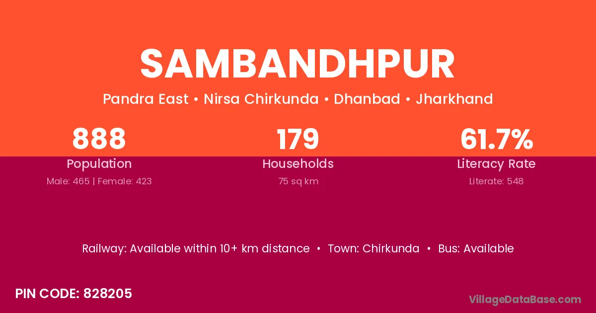 Chirkunda is the nearest town to Sambandhpur village for major economic activities