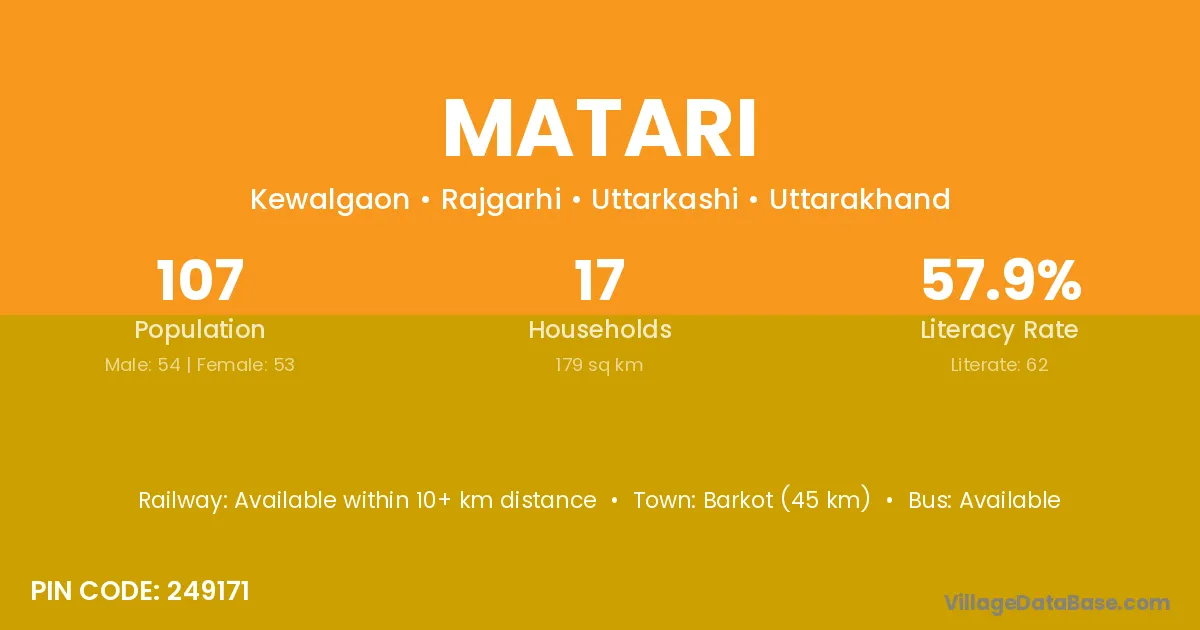 The literacy rate of Matari village is 60.84%. Male literacy stands at 72.15% and female literacy at 48.73%.