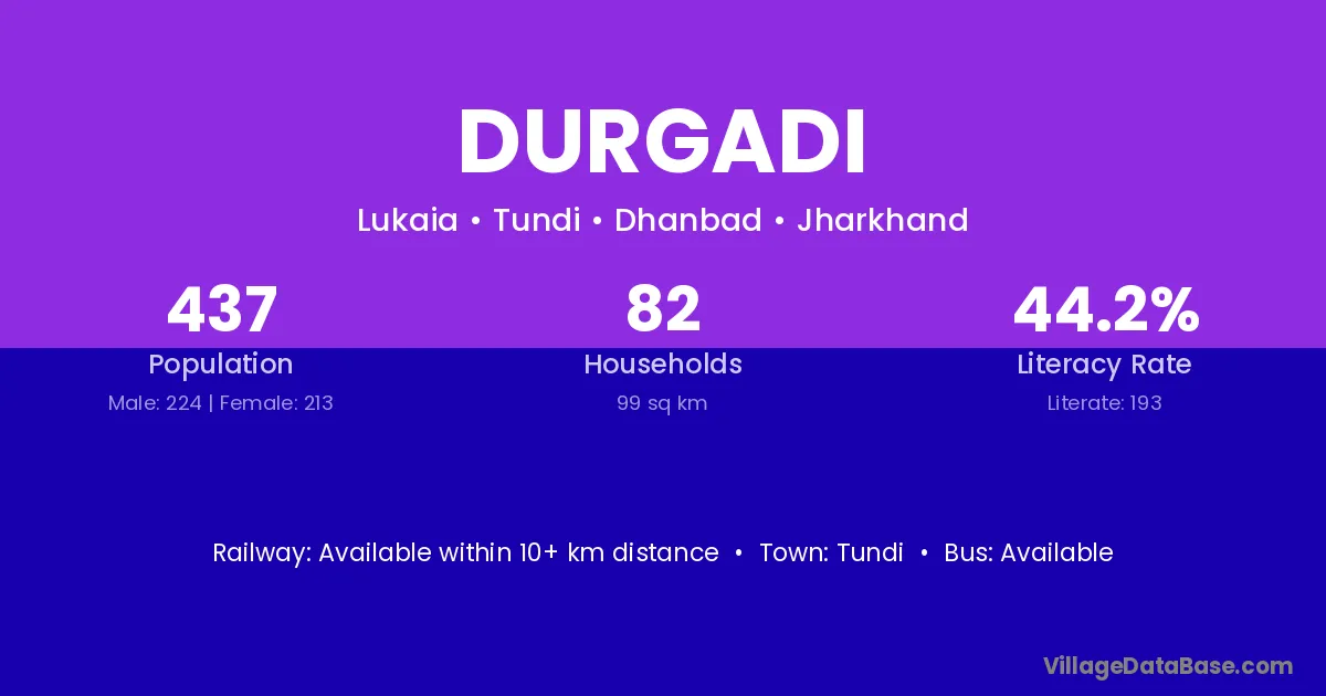 Durgadi village has a total population of 437 people, of which 224 are males and 213 are females.