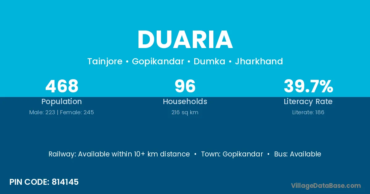 According to Census 2011 information, the village code of Duaria village is 814145.