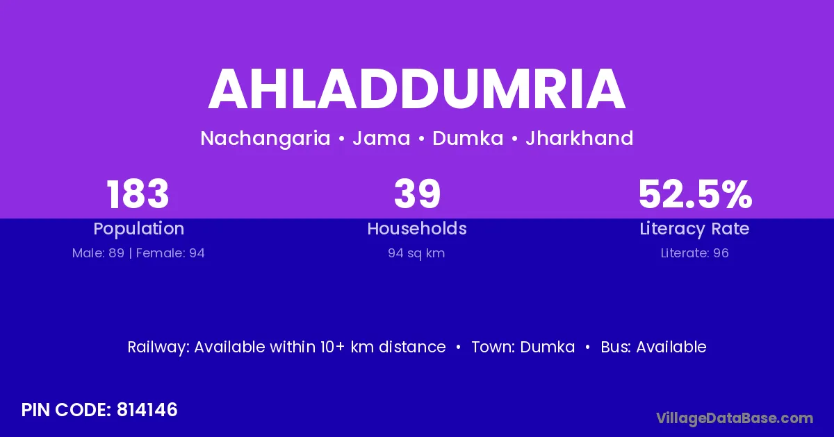 Ahladdumria village has a total population of 183 people, of which 89 are males and 94 are females.