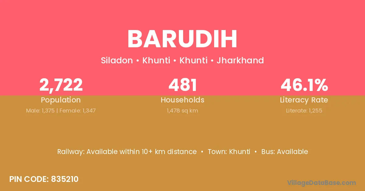 The literacy rate of Barudih village is 30.45%. Male literacy stands at 41.82% and female literacy at 19.09%.