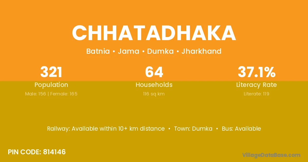 Chhatadhaka village has a total population of 321 people, of which 156 are males and 165 are females.