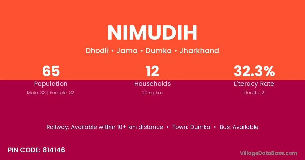 Nimudih village has a total population of 65 people, of which 33 are males and 32 are females.