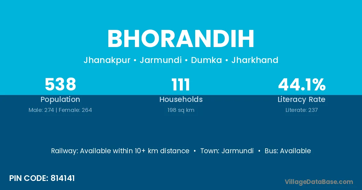 Bhorandih village has a total population of 538 people, of which 274 are males and 264 are females.