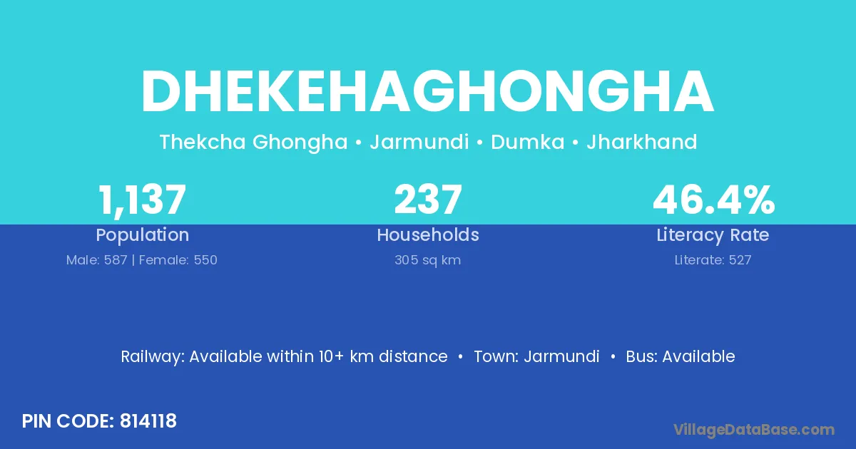 Dhekehaghongha village has a total population of 1,137 people, of which 587 are males and 550 are females.