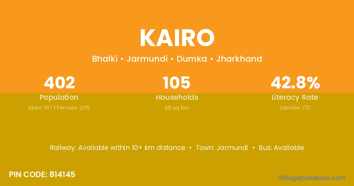 Kairo village has a total population of 402 people, of which 197 are males and 205 are females.