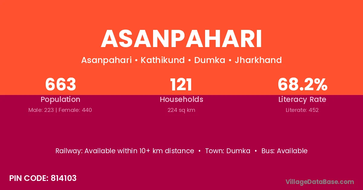 Asanpahari village has a total population of 663 people, of which 223 are males and 440 are females.