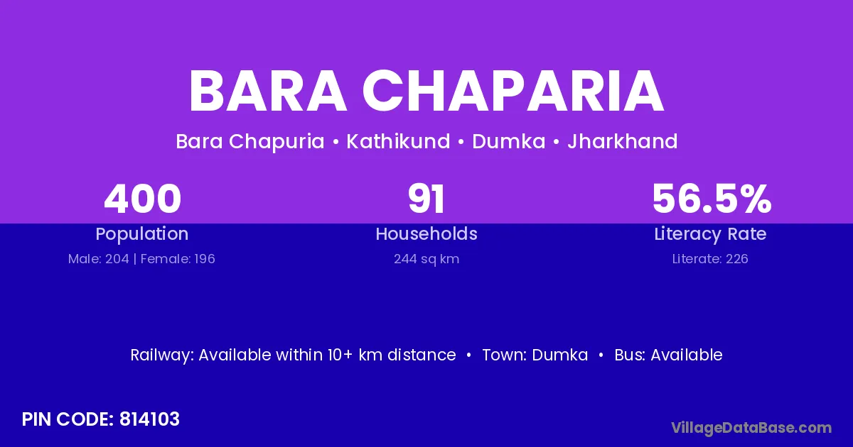 Bara Chaparia village has a total population of 400 people, of which 204 are males and 196 are females.