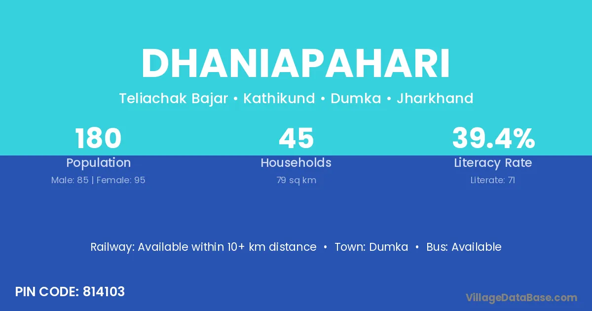 Dhaniapahari village has a total population of 180 people, of which 85 are males and 95 are females.
