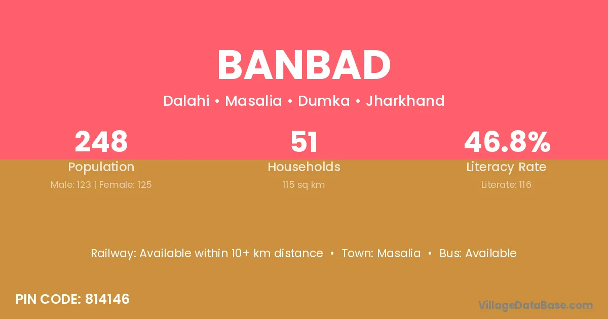 Banbad village has a total population of 248 people, of which 123 are males and 125 are females.