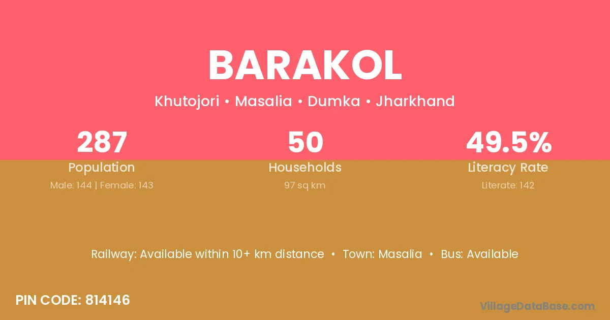 Barakol village has a total population of 287 people, of which 144 are males and 143 are females.