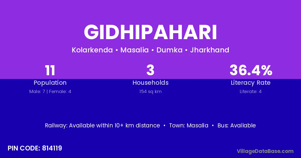Gidhipahari village has a total population of 11 people, of which 7 are males and 4 are females.