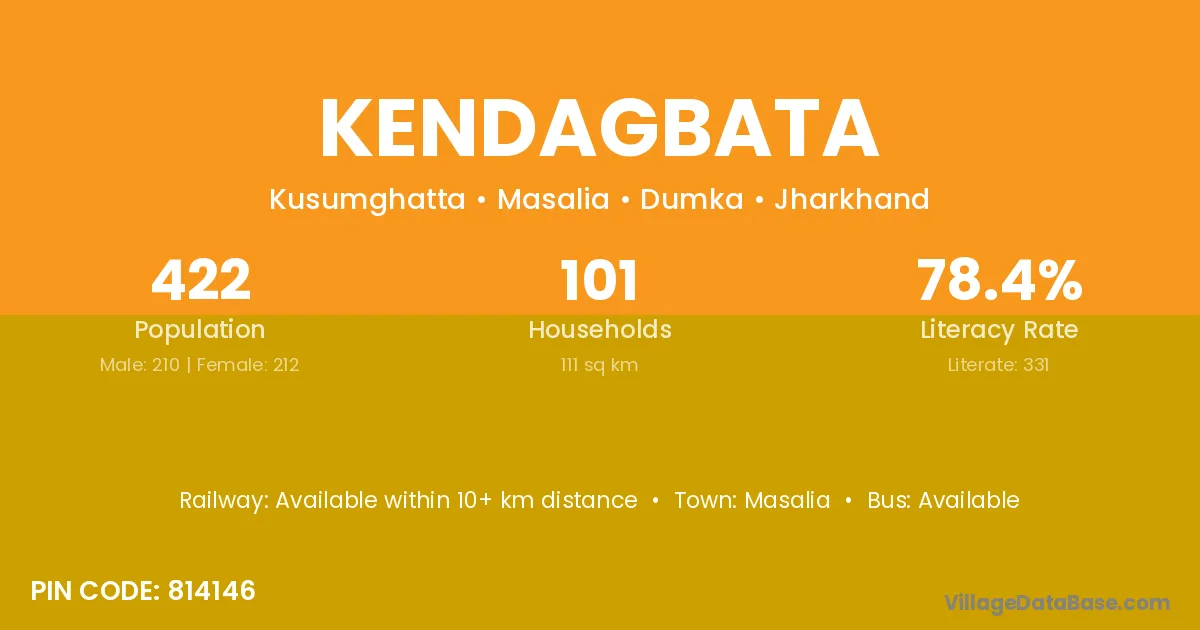 Kendagbata village has a total population of 422 people, of which 210 are males and 212 are females.