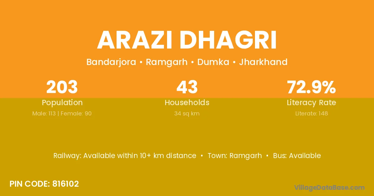 Arazi Dhagri village has a total population of 203 people, of which 113 are males and 90 are females.