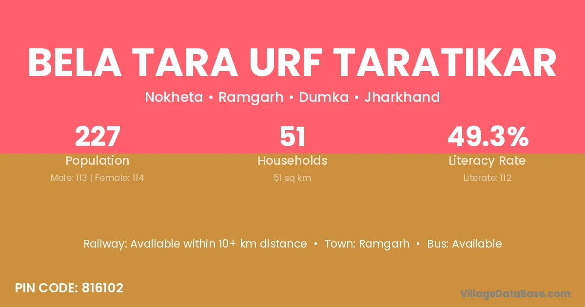 Bela Tara Urf Taratikar village has a total population of 227 people, of which 113 are males and 114 are females.