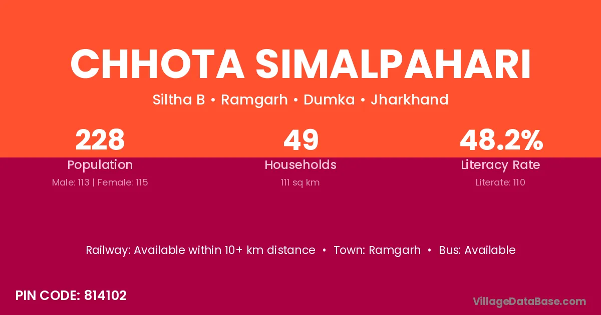 Chhota Simalpahari village has a total population of 228 people, of which 113 are males and 115 are females.