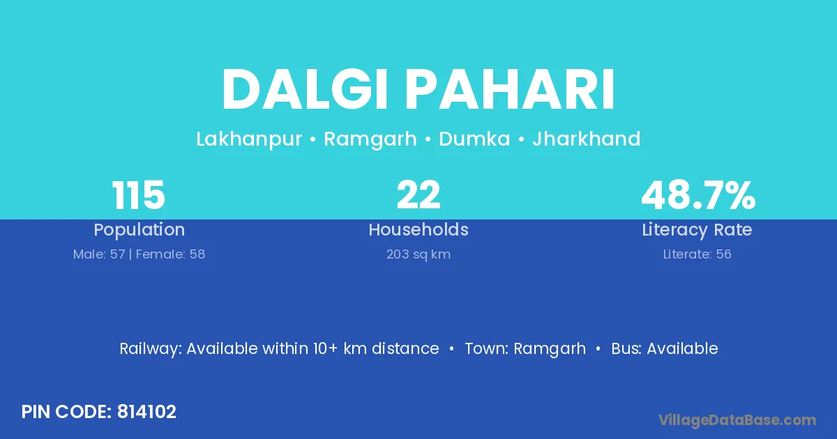 Dalgi Pahari village has a total population of 115 people, of which 57 are males and 58 are females.