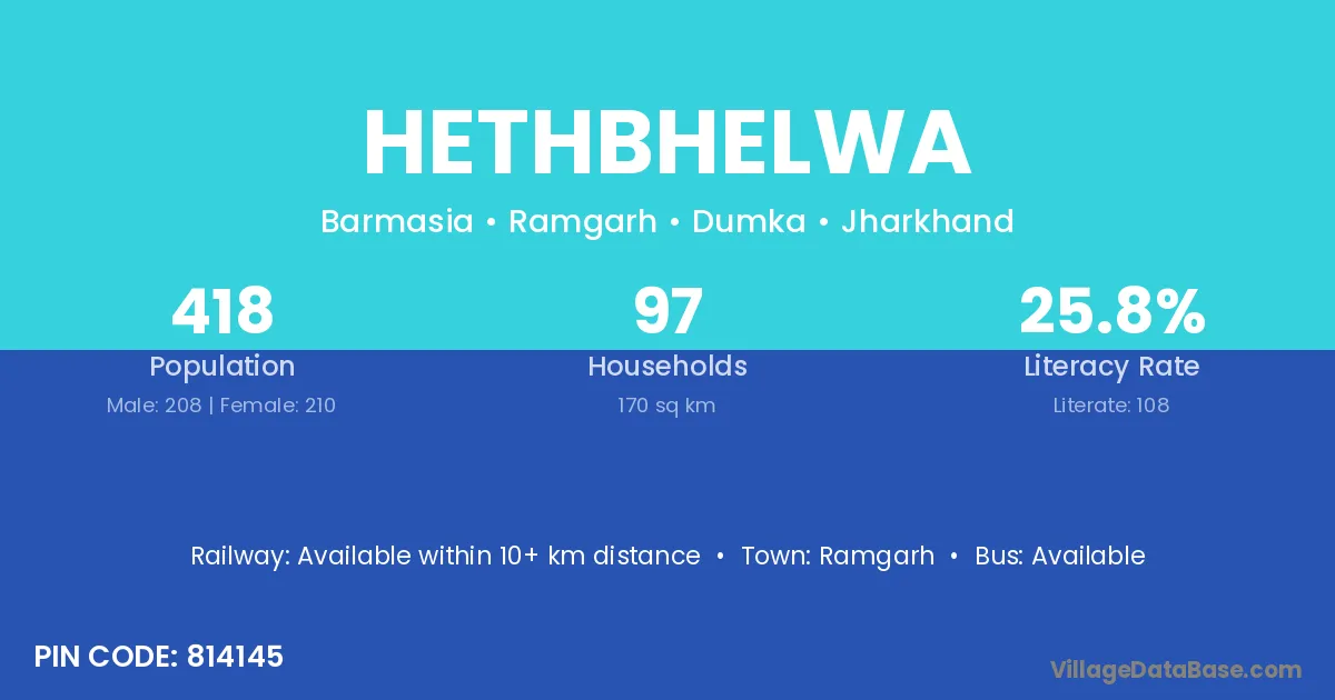 Hethbhelwa village has a total population of 418 people, of which 208 are males and 210 are females.