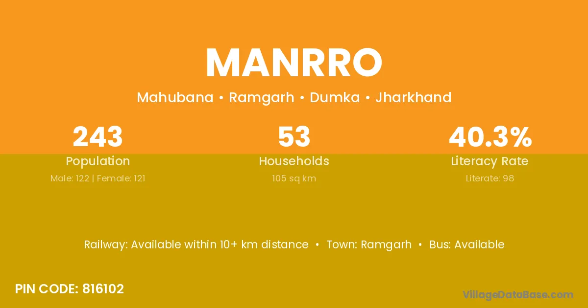 Manrro village has a total population of 243 people, of which 122 are males and 121 are females.