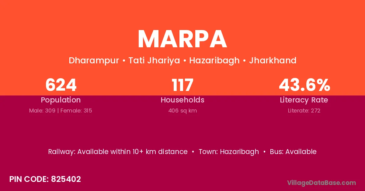 The literacy rate of Marpa village is 37.46%. Male literacy stands at 49.78% and female literacy at 26.42%.