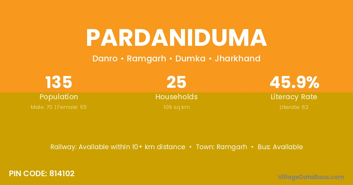 Pardaniduma village has a total population of 135 people, of which 70 are males and 65 are females.