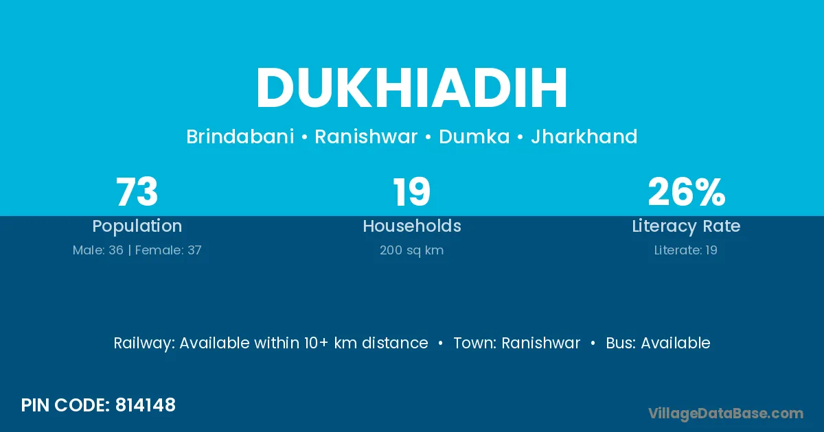Dukhiadih village has a total population of 73 people, of which 36 are males and 37 are females.