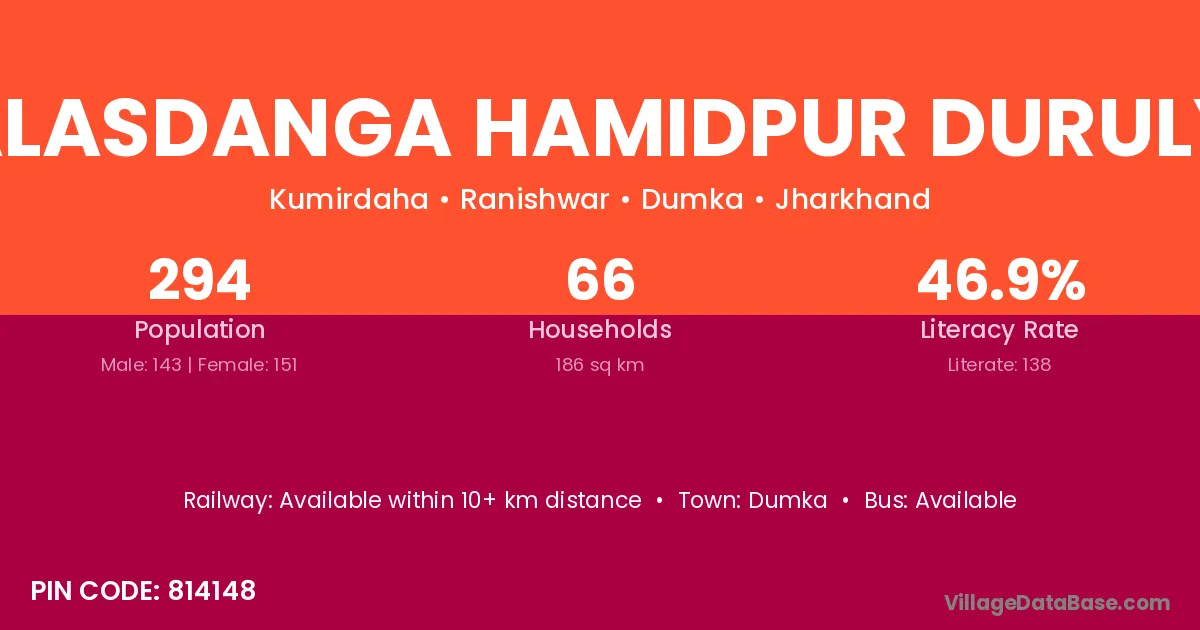 Palasdanga Hamidpur Durulya village has a total population of 294 people, of which 143 are males and 151 are females.