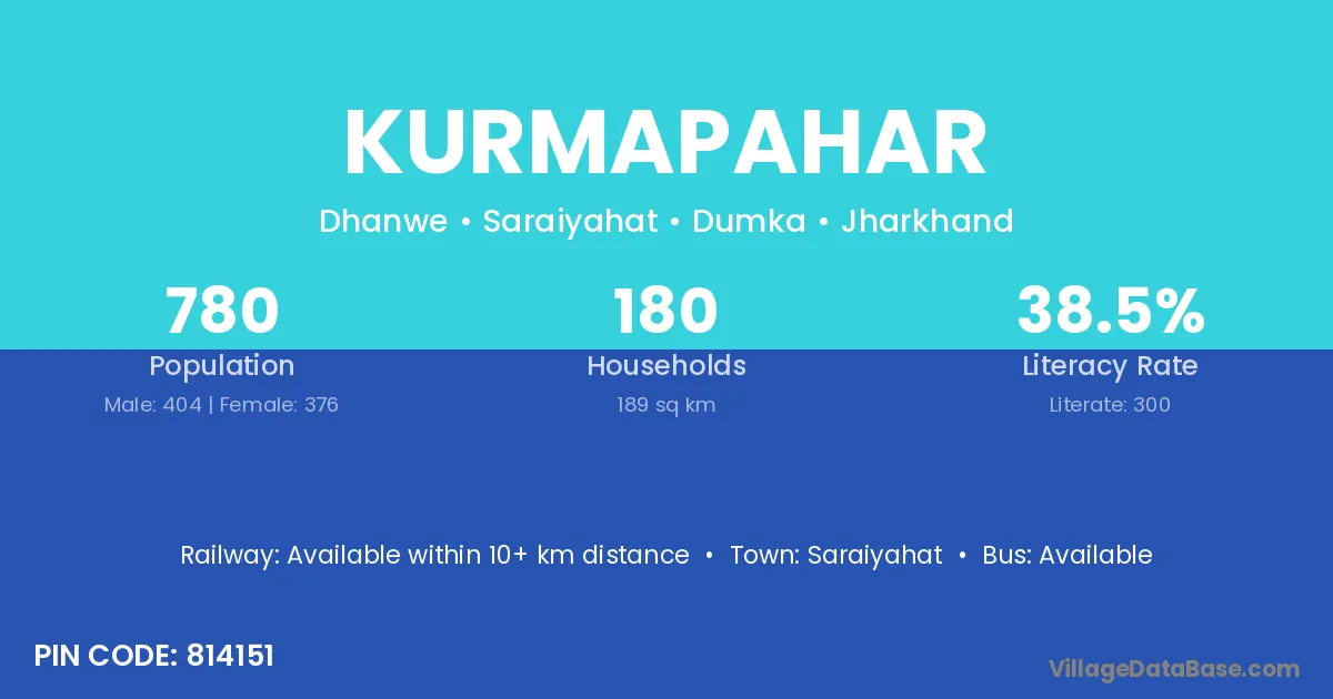 Kurmapahar village has a total population of 780 people, of which 404 are males and 376 are females.