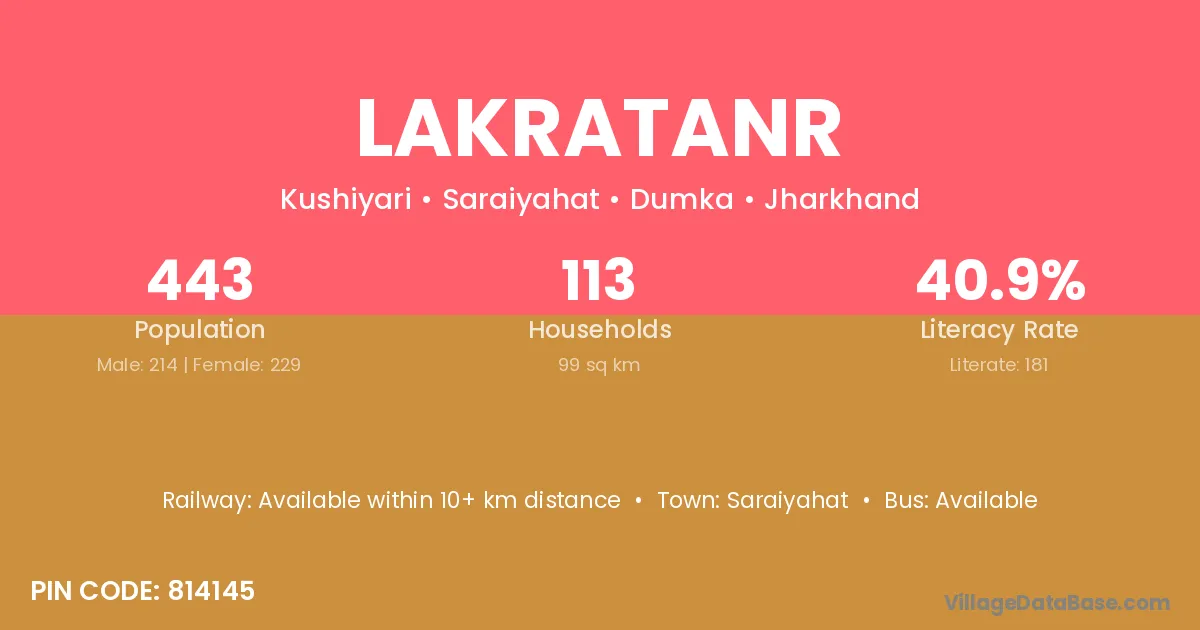 Lakratanr village has a total population of 443 people, of which 214 are males and 229 are females.