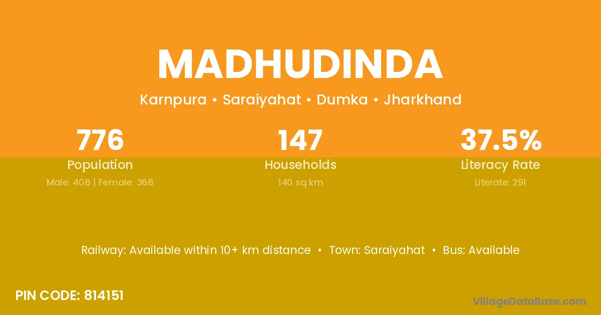 Madhudinda village has a total population of 776 people, of which 408 are males and 368 are females.
