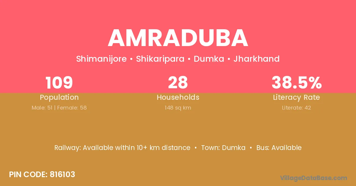 The literacy rate of Amraduba village is 38.53%. Male literacy stands at 54.90% and female literacy at 24.14%.