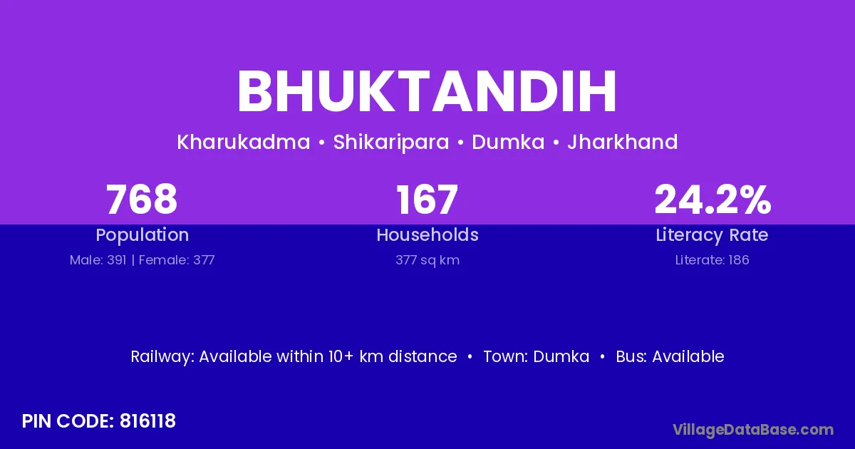 Dumka is the nearest town to Bhuktandih village for major economic activities