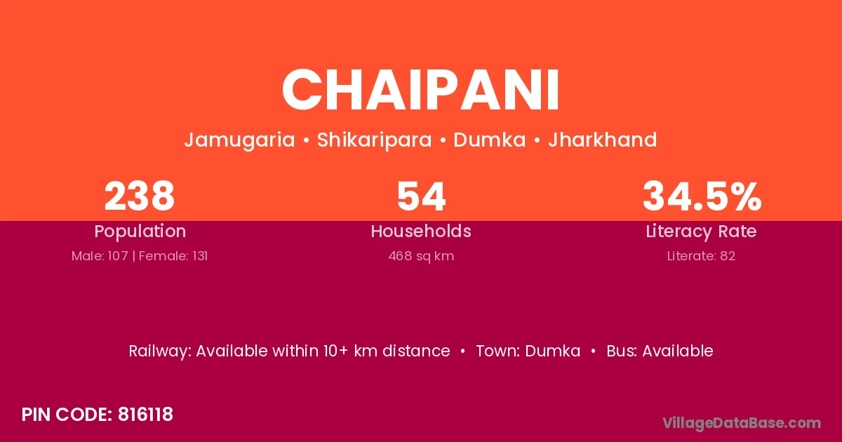 Chaipani village has a total population of 238 people, of which 107 are males and 131 are females.