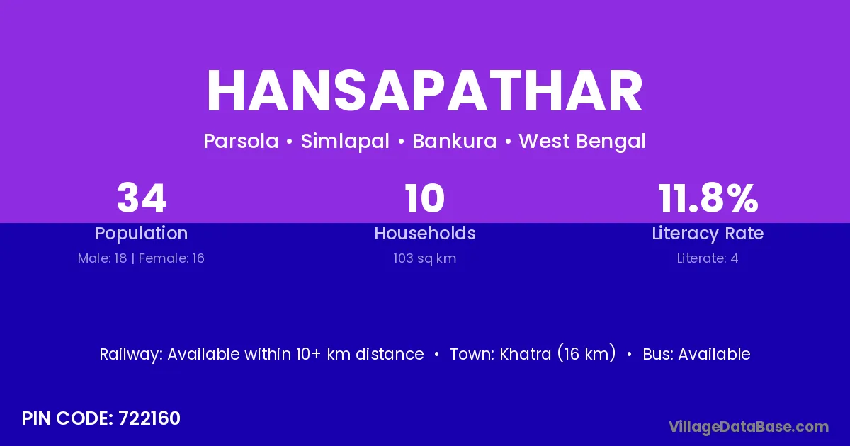Hansapathar village has a total population of 869 people, of which 438 are males and 431 are females.