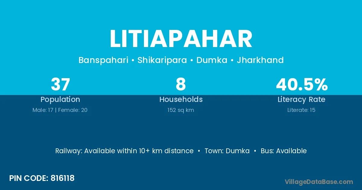 The literacy rate of Litiapahar village is 40.54%. Male literacy stands at 70.59% and female literacy at 15.00%.