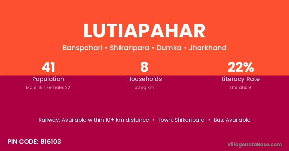 The literacy rate of Lutiapahar village is 21.95%. Male literacy stands at 31.58% and female literacy at 13.64%.