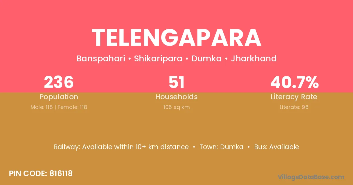 Telengapara village has a total population of 236 people, of which 118 are males and 118 are females.