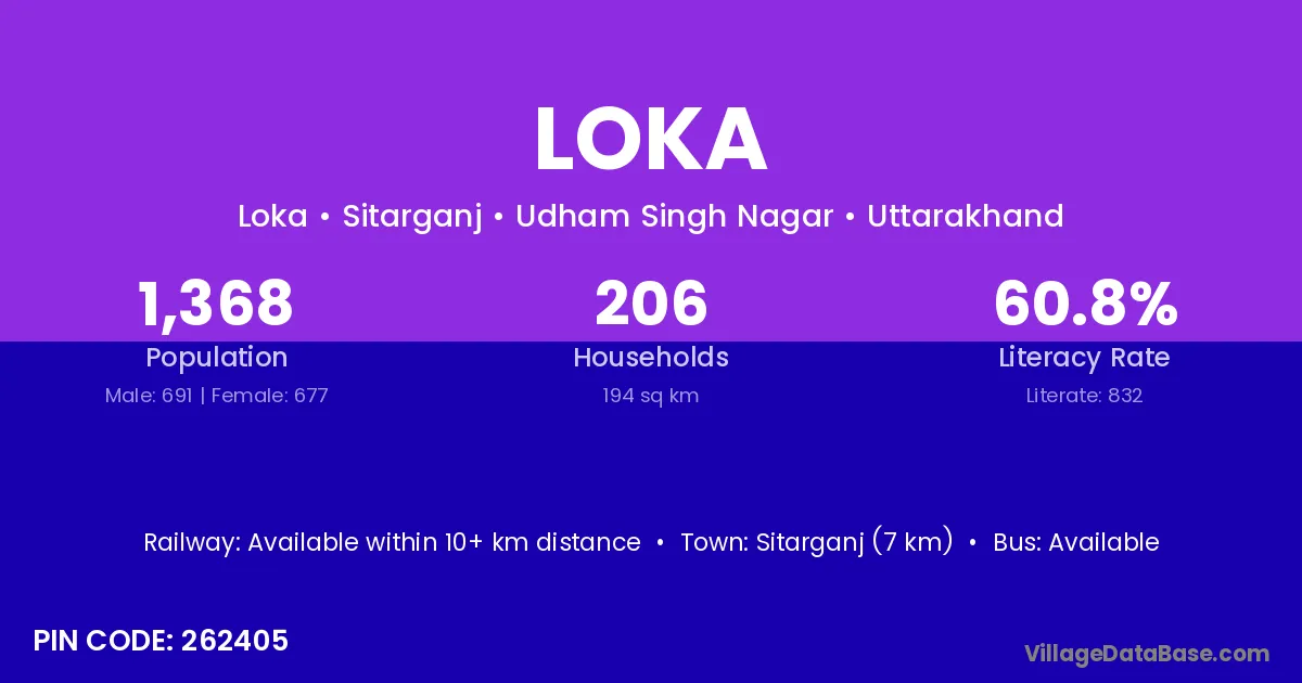 The literacy rate of Loka village is 46.19%. Male literacy stands at 59.34% and female literacy at 32.29%.