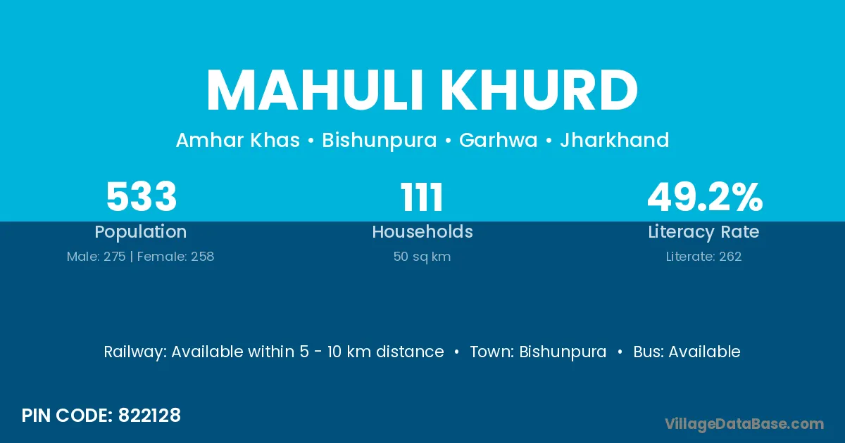 Mahuli Khurd village has a total population of 533 people, of which 275 are males and 258 are females.