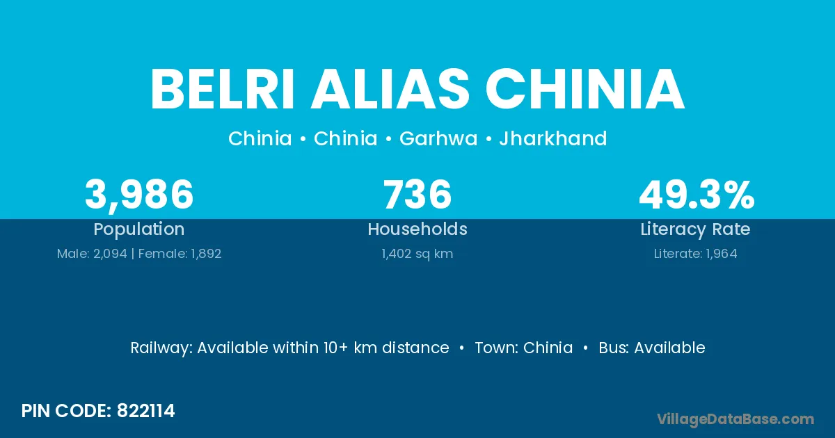 Belri Alias Chinia village has a total population of 3,986 people, of which 2,094 are males and 1,892 are females.