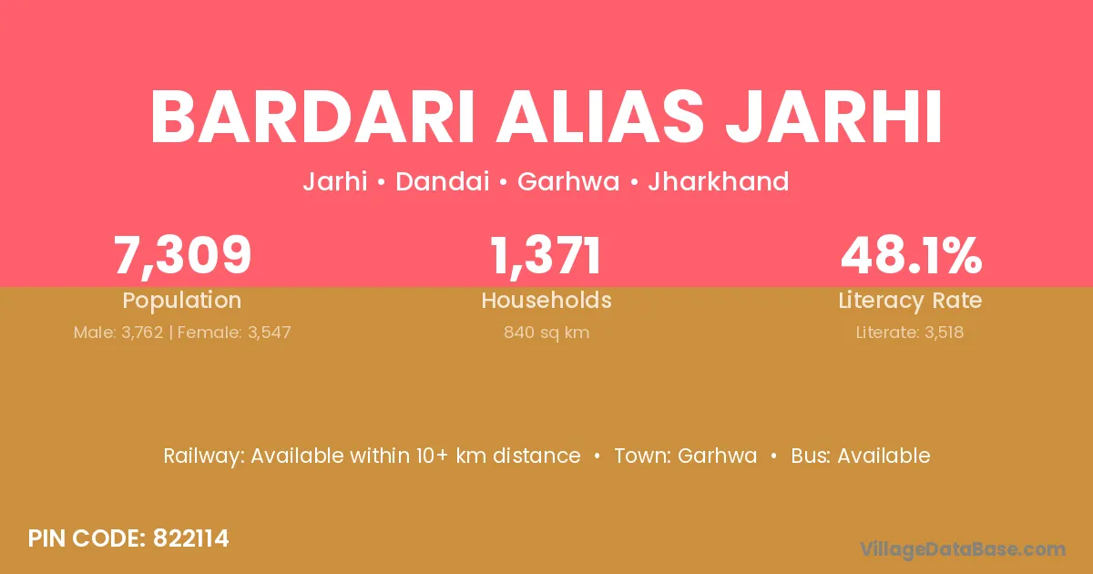 Bardari Alias Jarhi village has a total population of 7,309 people, of which 3,762 are males and 3,547 are females.