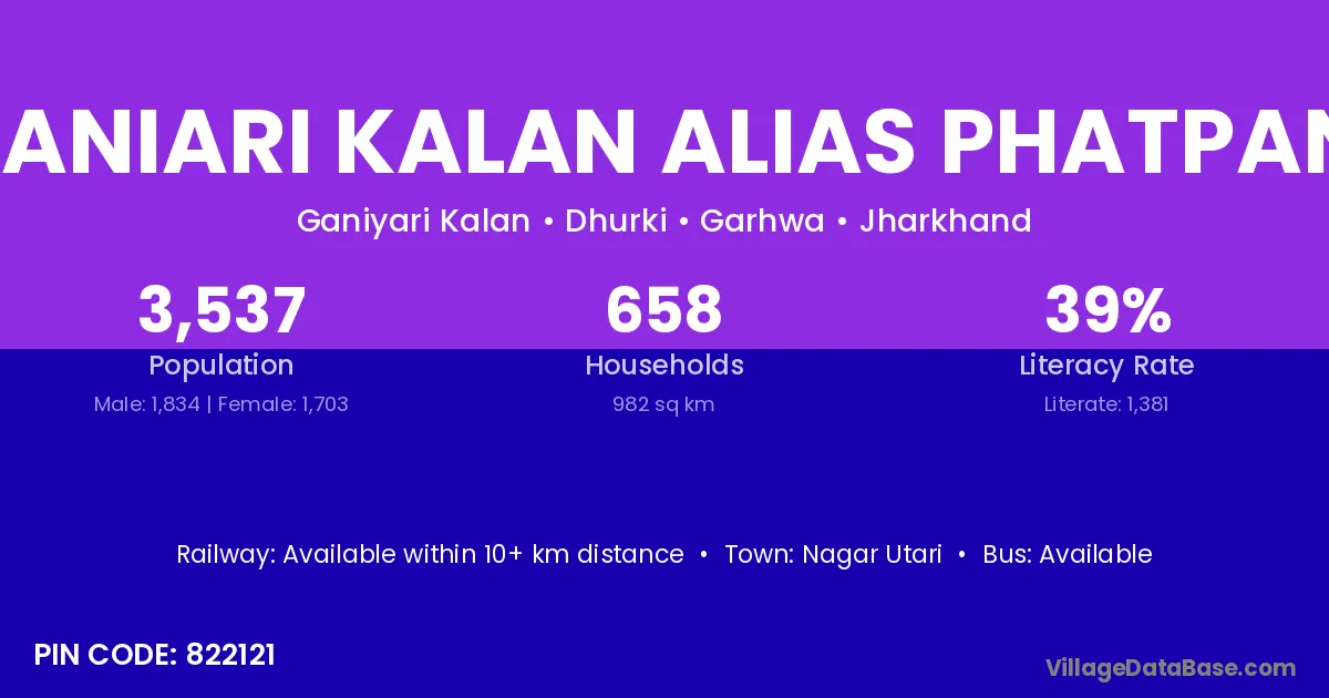 Ganiari Kalan Alias Phatpani village has a total population of 3,537 people, of which 1,834 are males and 1,703 are females.
