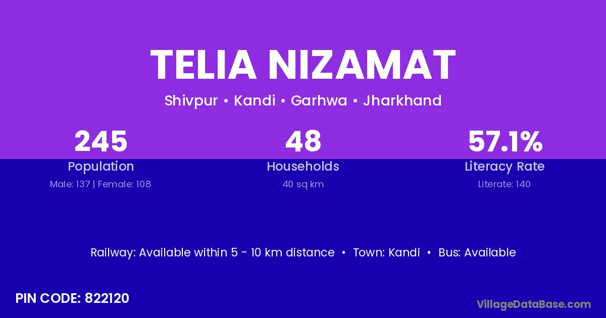 Telia Nizamat village has a total population of 245 people, of which 137 are males and 108 are females.