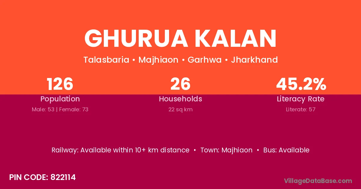 Ghurua Kalan village has a total population of 126 people, of which 53 are males and 73 are females.